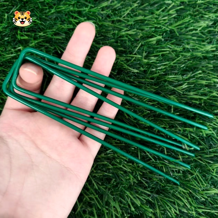 1. Material: The U-shaped ground nails are made of high-hardness galvanized steel with green plastic coating, featuring strong anti-rust and anti-corrosion properties for long outdoor durability.